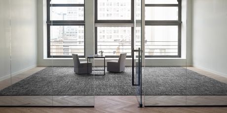 Course of Action is just that—a perfectly scaled pattern to keep the momentum. Small meeting areas and focus rooms call for a more toned-down vibe. Simple and elegant, Strictly Business quiets the room like a whisper. And like any great pairing, Course of Action and Strictly Business bring out the best in each other, each benefit from the companionship of the other, in an overlapping palette of cream, warm and cool grays, taupe, black, and navy. Now let’s get back to work.